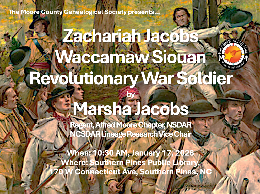 The program will be: “Zachariah Jacobs, Waccamaw Siouan, Revolutionary War Soldier” by Marsha Jacobs. Marsha is the Regent, Alfred Moore Chapter, NSDAR and Vice Chair, North Carolina State DAR Lineage Research.
